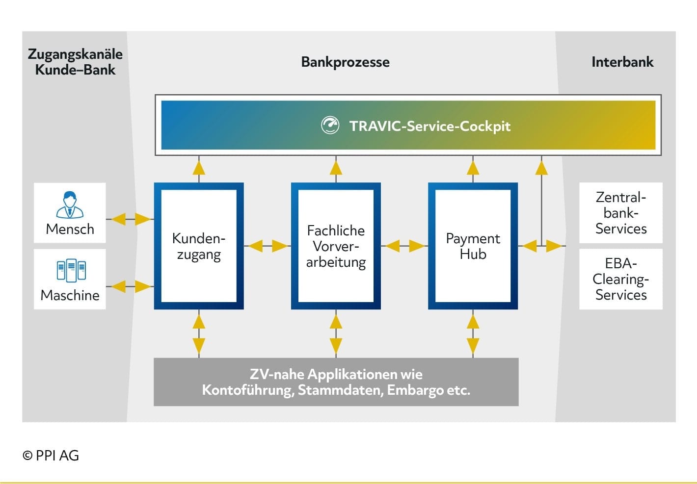 Diese Kernkomponente wird auch bei einer Aufteilung in unterschiedliche Ausprägungen immer benötigt. Sie sammelt die von den einzelnen Zahlungsverkehrsprodukten bereitgestellten Informationen und übergibt sie den jeweiligen Komponenten zur weiteren Verarbeitung.