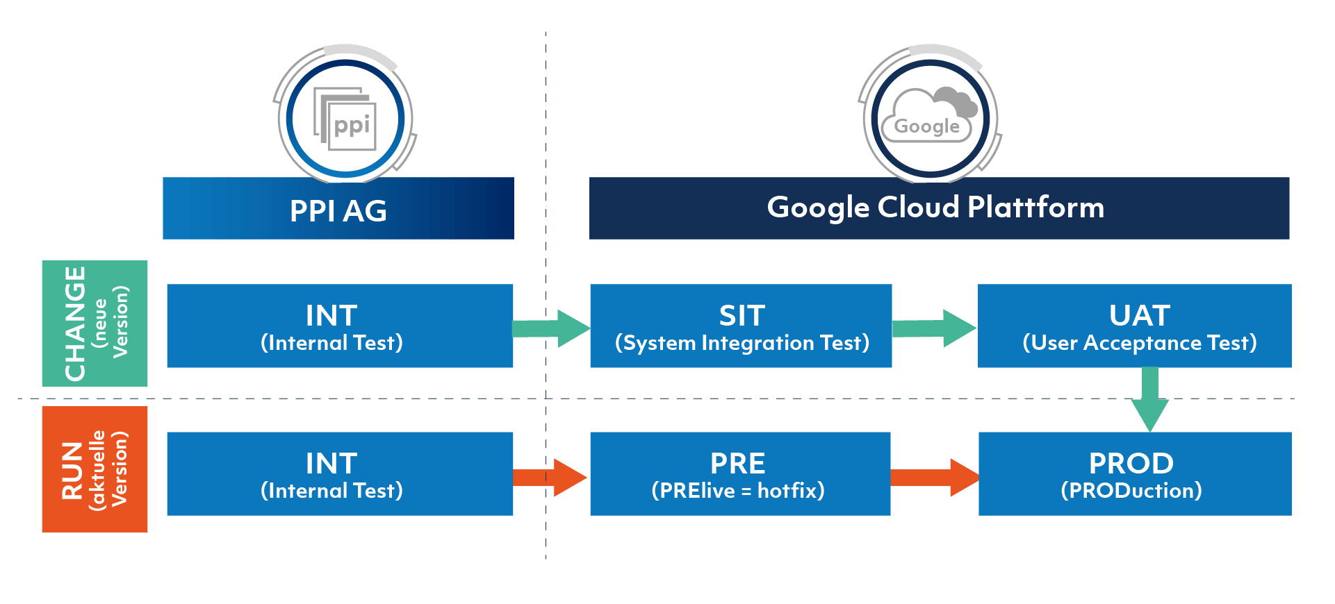 Letzteres gibt den Ausschlag dafür, dass sich die Service-Architektur innerhalb der Cloud automatisiert aufbauen lässt. Infrastructure as Code und ein eigens entwickeltes Software-Werkzeug („Stagedive“) führen inzwischen dazu, dass auf den von PPI für verschiedene Banken betriebenen Zahlungsverkehrsplattformen manuelle Fehler, insbesondere beim Staging (vgl. Abb. 2) kaum noch auftreten können, weil alles automatisiert abläuft.